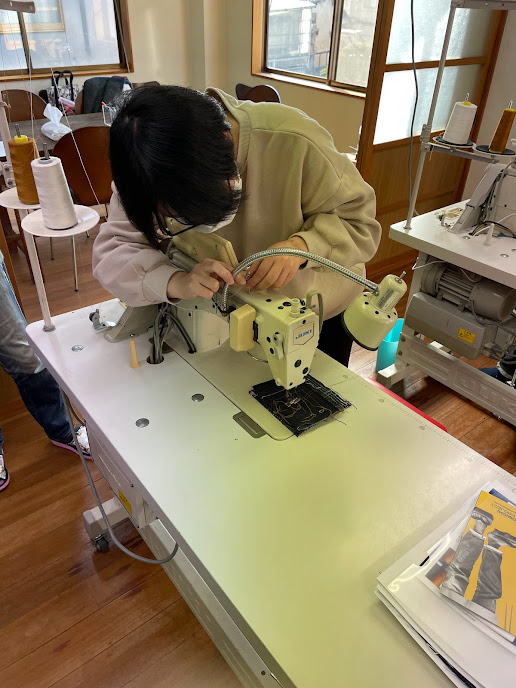工業用のミシンを初めて使うので、先生の見よう見まねで挑戦。